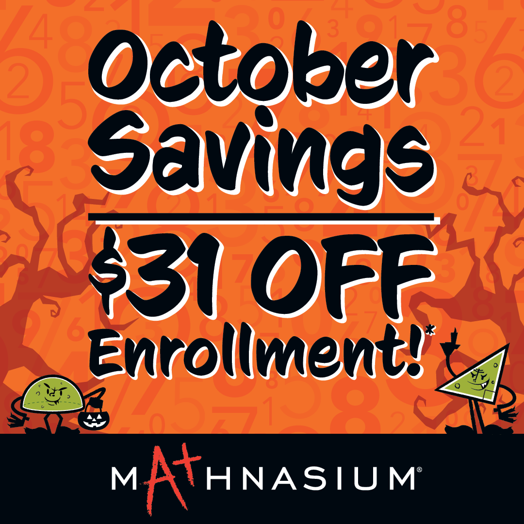 We're handing out a spooktacular deal this month! You get $31 off tuition for October, November, and December, and your child gets a boost in their math skills! We use a variety of learning methods to keep kids motivated, and we make math monstrously fun! Enroll in October and get $31 off tuition in October, November, and December.